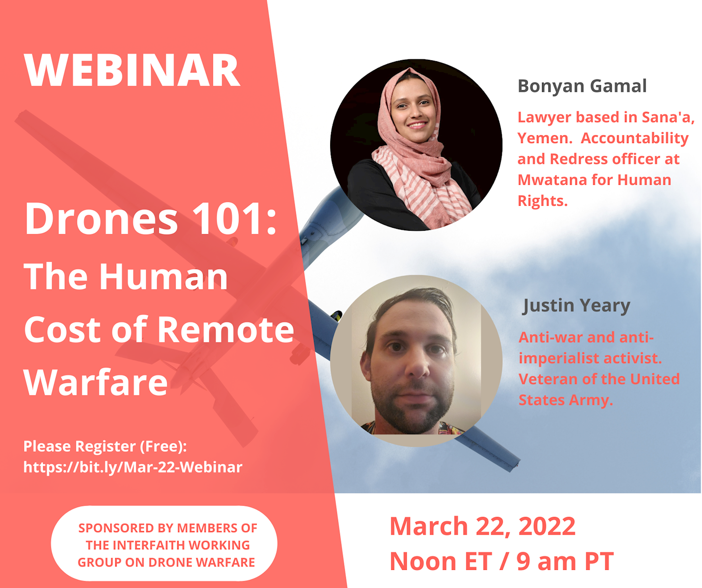 Members of the Interfaith Working Group on Drone Warfare will also be on to share how you can participate in advocacy to ban or restrict drone warfare.